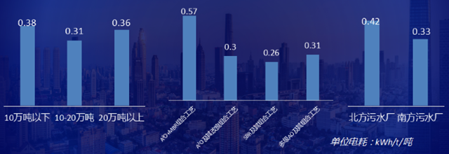 低碳化方面比选出3个细分榜单,8座污水厂入围,上榜5座。城市污水厂正由节能降耗向绿色低碳循环、系统融合的方向转型,但目前行业低碳化才刚刚起步。入围的64座污水厂中最低单吨电耗达到0.12kWh/吨,最高单吨电耗0.69kWh/吨,而地下污水厂和地上污水厂的单位运营电耗差距较大,其中,地下污水厂平均电耗0.73kWh/吨。(剔除可再生能源利用及污泥处置发电耗电等外部电耗,剔除地下污水厂提升排放、通风等高电耗因素影响)此外,工艺选择及南北差异均对能耗影响明显。