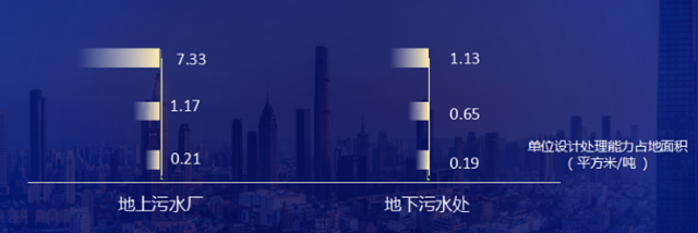 空间高效利用上,目前还是以地下水厂为主。入围的污水厂平均单位设计规模占地面积为1.1平方米/吨,而地下污水处的平均单位占地面积为0.53平方米/吨。地上空间的利用主要途径是办公场所、停车场、公园等公共区域,地下空间利用主要是办公、展览展示等。